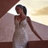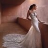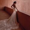 Abito da sposa lungo in stile sirena, confezionato interamente in pizzo. Lo scollo a V profondo con spallini sottili regala sensualità e leggerezza, mentre la coda sontuosa in pizzo e tulle completa il look con un tocco romantico e scenografico.