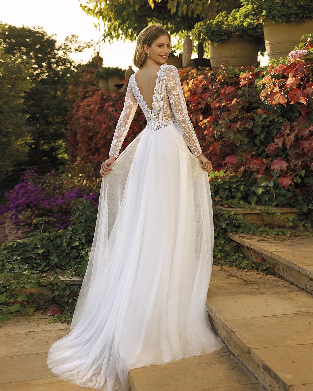 Abito da sposa A-line in tulle leggero e fluido, con gonna e strascico dall’aspetto etereo. Il corpetto in pizzo trasparente, impreziosito da maniche lunghe, è completato da una seducente scollatura a V che si ripete anche sulla schiena, creando un effetto raffinato e di grande impatto.
