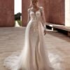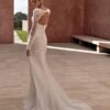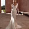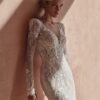 Abito da sposa a sirena dallo stile elegante e seducente. Le maniche lunghe ricche di dettagli in pizzo e lo scollo a V profondo esaltano la femminilità, mentre la schiena ad oblò dona un effetto scenografico e glamour perfetto per stupire.