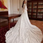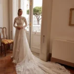 Un’opera d’arte versatile, questo abito a sirena è completato da un bolero con collo alto e una gonna rimovibile che regala un volume maestoso. Il pizzo finissimo, arricchito da un’elegante cintura, permette alla sposa di passare da un look principesco a uno più sensuale con un semplice gesto.