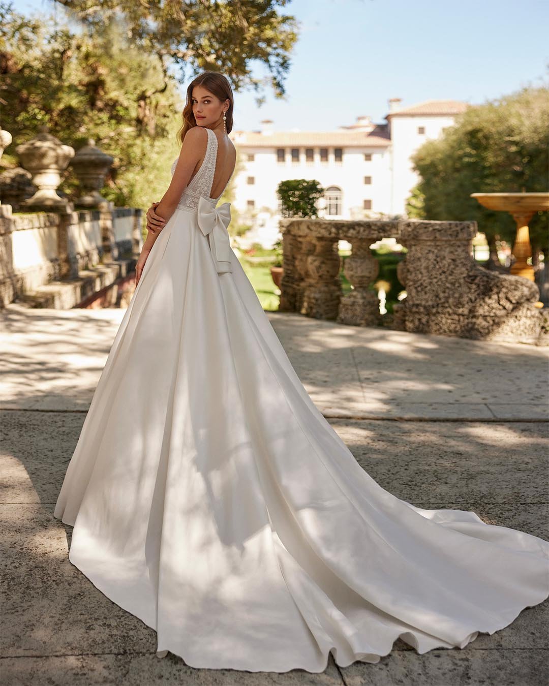 Il profondo scollo dona femminilità e raffinatezza, mentre il fiocco decorativo sulla schiena aggiunge un tocco romantico e sofisticato. La gonna con tasche integrate completa il modello con un dettaglio moderno e funzionale, perfetto per una sposa che cerca eleganza e praticità.