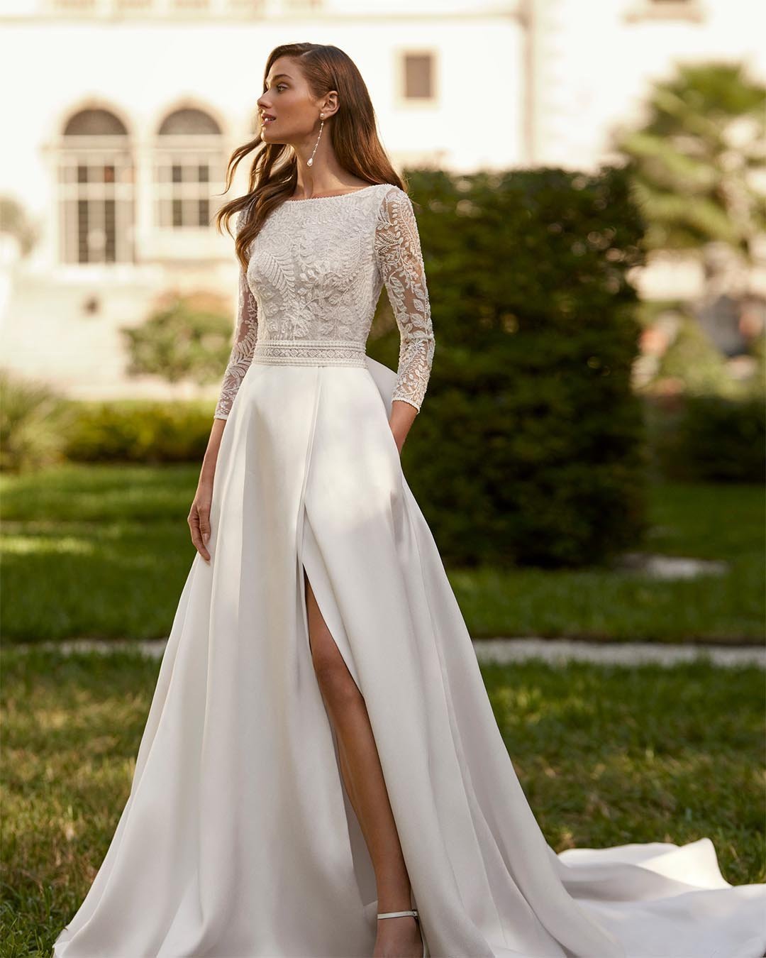 Abito da sposa sofisticato in pizzo, mikado in seta e strass. Il corpetto con scollo a barchetta e maniche francesi esprime raffinatezza ed equilibrio, mentre la schiena scollata dona un tocco sensuale. La gonna in mikado, arricchita da uno spacco frontale, completa il modello con un dettaglio moderno e di grande classe.