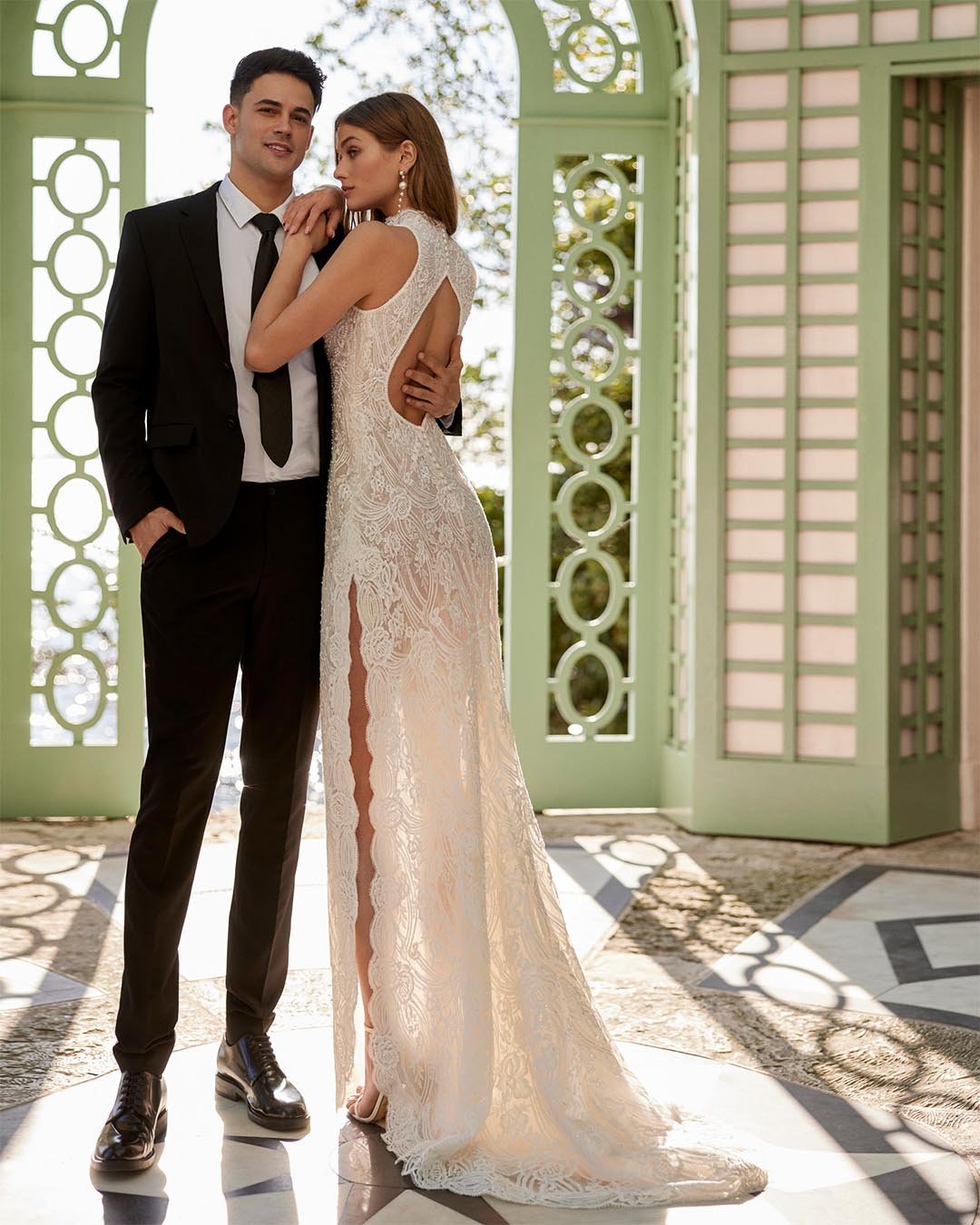 Abito da sposa realizzato in esclusivo pizzo e tulle ricamato con strass. Il taglio dritto con linea a sirena esalta la silhouette, mentre lo scollo all’americana e l’apertura a goccia sulla schiena aggiungono sensualità e raffinatezza. La gonna con ampio spacco laterale completa il modello, donando movimento ed eleganza contemporanea.
