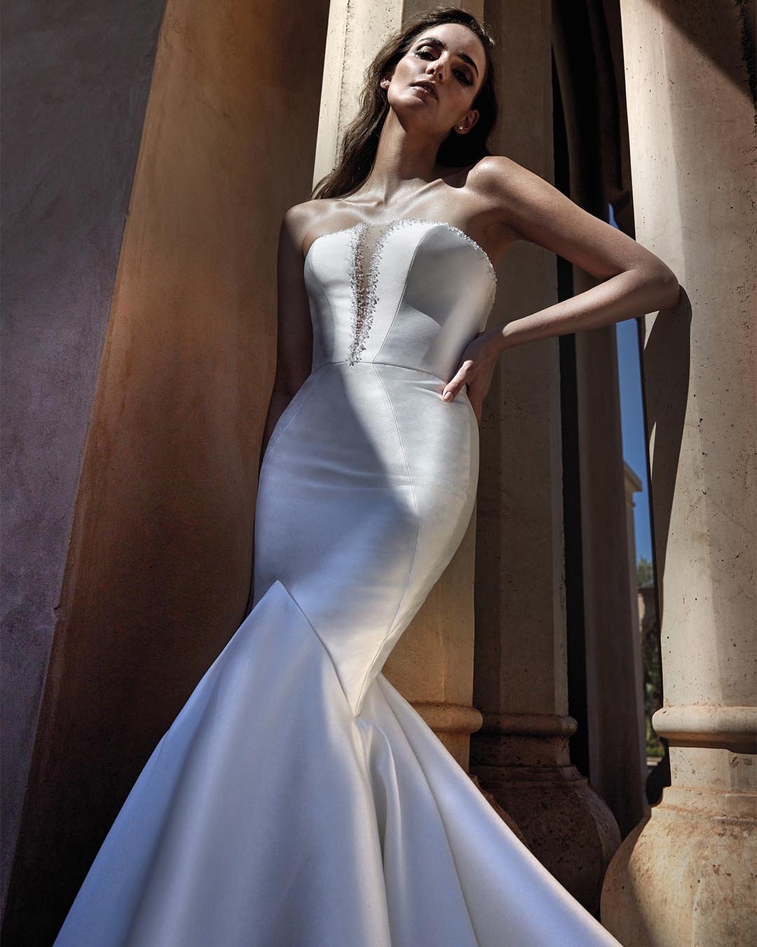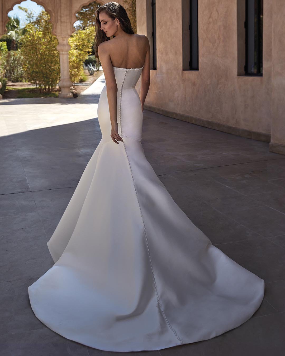 Abito da sposa a sirena realizzato in pregiato mikado in seta. Il corpetto affascina con una profonda scollatura a V, arricchita da delicate perline e cristalli Swarovski, mentre la gonna a sirena scivola armoniosa, completata da una lunga fila di bottoncini foderati che si estende fino allo strascico principesco. Un modello di grande eleganza che unisce lusso e raffinatezza.