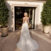 Abito da sposa con corpino ricamato e scollo a cuore con spalline. La gonna morbida in georgette cade fluida lungo la silhouette e si apre in un sensuale spacco laterale, aggiungendo movimento ed eleganza a un modello raffinato e femminile.