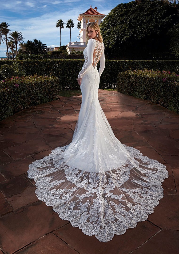 Abito da sposa a sirena in morbido crêpe, con raffinate maniche lunghe che avvolgono le braccia con eleganza. La scollatura sulle spalle con effetto tattoo esalta la femminilità con un delicato gioco di trasparenze, mentre la linea aderente scolpisce la silhouette donando fascino e raffinatezza.