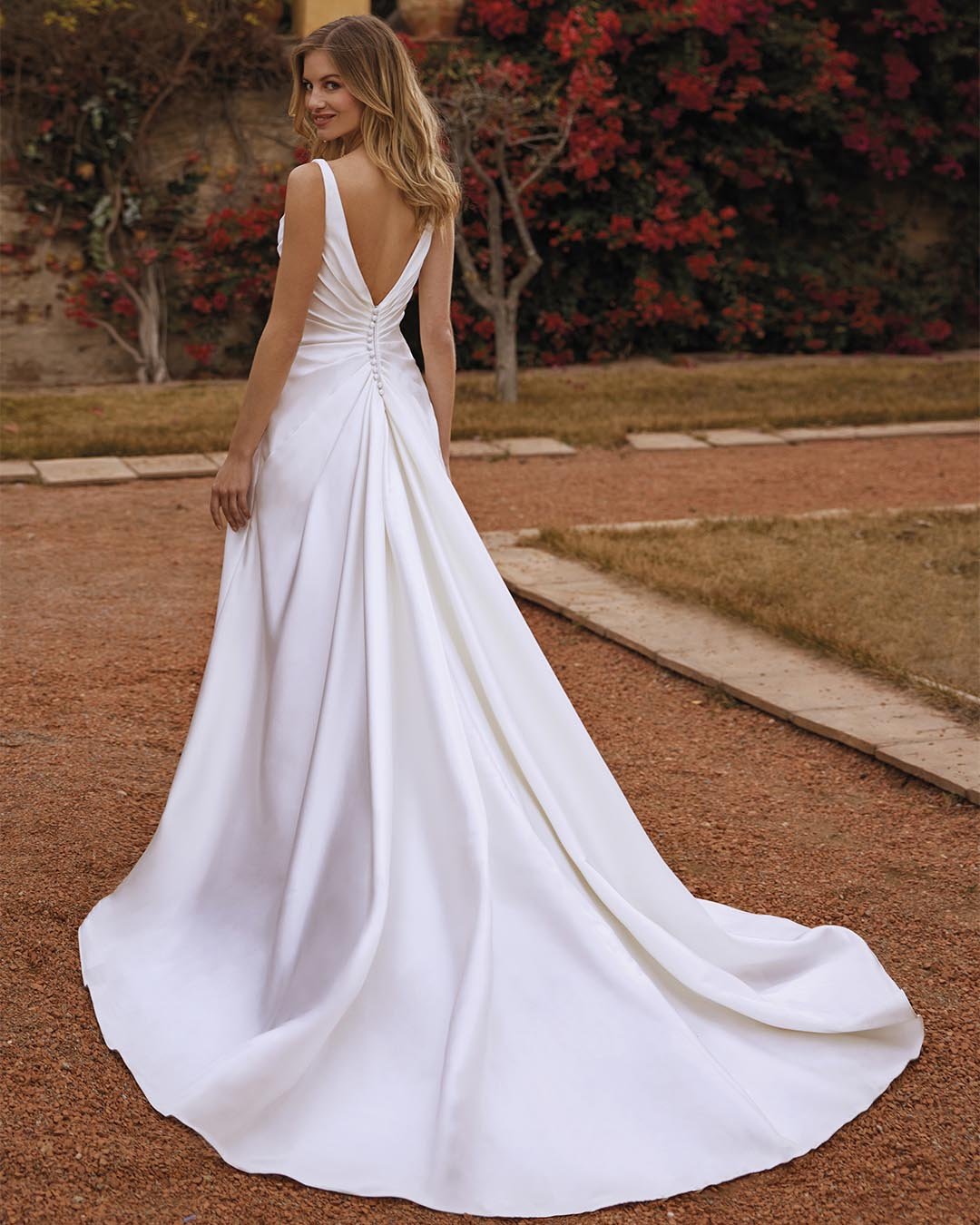 Abito da sposa in mikado di seta, dal taglio sofisticato e lineare, caratterizzato da un raffinato scollo a V sia sul davanti che sul retro. Il corpetto drappeggiato sottolinea con eleganza il punto vita, mentre la gonna fluida con ampio spacco laterale slancia la figura e dona un tocco di sensualità moderna. Lo strascico leggero completa con grazia un design essenziale ma di grande impatto.