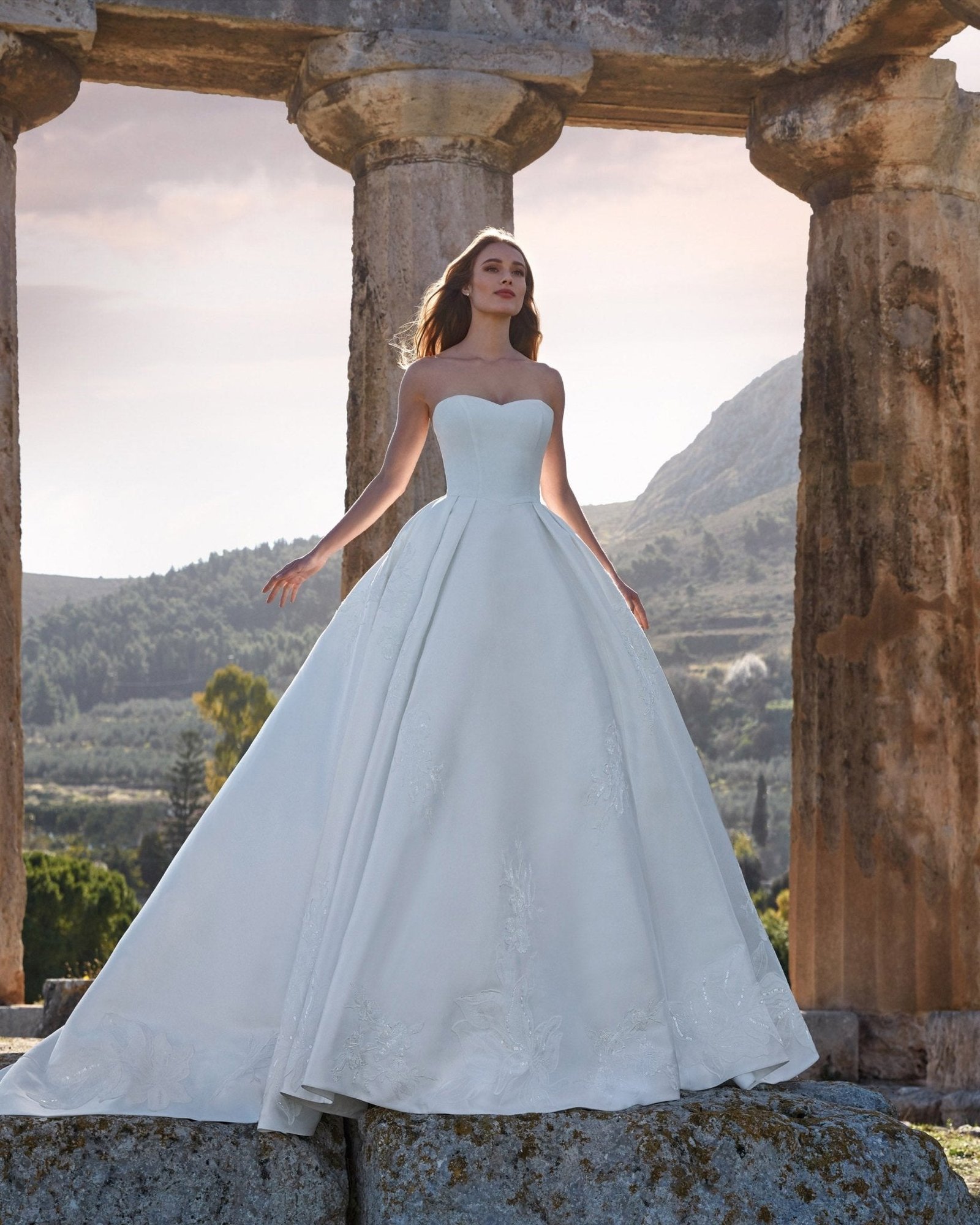 Abito da sposa principesco in mikado off white e scollatura a cuore senza spalline. I ricami di perle tone sur tone creano un effetto 3D raffinato sull’ampia gonna.