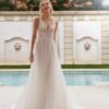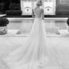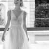 Abito da sposa romantico in tulle, caratterizzato da un raffinato corpetto ricamato con scollo a V e spalline sottili. La schiena semi-trasparente regala un tocco di sensualità, mentre la gonna scivolata in tulle leggero si apre in un etereo strascico che accompagna con grazia ogni passo. Un modello che unisce eleganza e freschezza per una sposa dallo stile senza tempo.