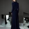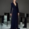 Abito da cerimonia in crêpe. Con scollo sotto le spalle e fiori.
