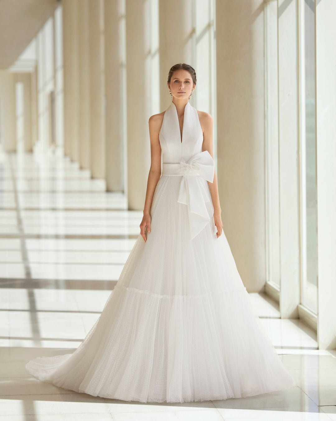 L’abito da sposa in stile principessa Uday è molto versatile. La voluminosa gonna in tulle contrasta con il suo corpetto liscio, che culmina in uno scollo all’americana di tendenza e una schiena completamente scoperta. Colpisce il lungo strascico, che apporta uno stile molto romantico, ideale per una cerimonia civile.