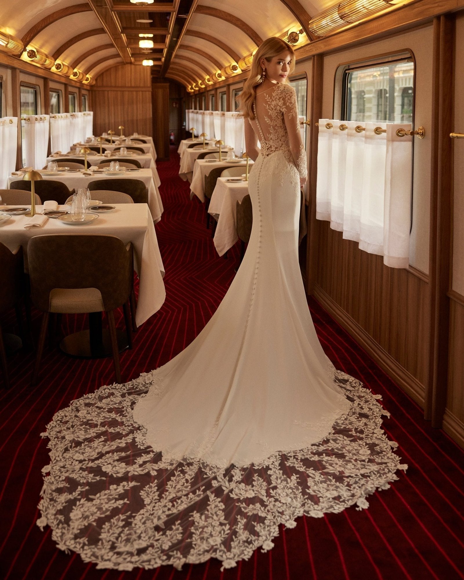 Abito da sposa sirena lungo in stile moderno, confezionato in crêpe con intarsi di pizzo e strass. Il profondo scollo a V slancia la figura, mentre la schiena chiusa da una delicata abbottonatura aggiunge un tocco classico e armonioso. Le maniche lunghe in pizzo completano il look con raffinatezza, creando un equilibrio tra sensualità ed eleganza.