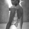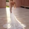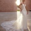 Abito da sposa a sirena in crêpe. Il corpetto è impreziosito da ricami in pizzo, mentre la schiena effetto tattoo regala un dettaglio sofisticato e moderno. Completa il modello il lungo strascico in pizzo dal fascino glamour.