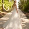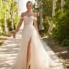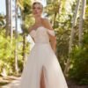 Un abito da sposa principesco in tulle, che conquista con il suo corpetto a cuore ricamato e le delicate spalline che scendono morbidamente sulle braccia. La gonna ampia e fluida si apre con un sensuale spacco frontale, regalando movimento e leggerezza ad ogni passo. Lo strascico vaporoso completa un look romantico e seducente, perfetto per una sposa moderna che vuole unire eleganza e femminilità.