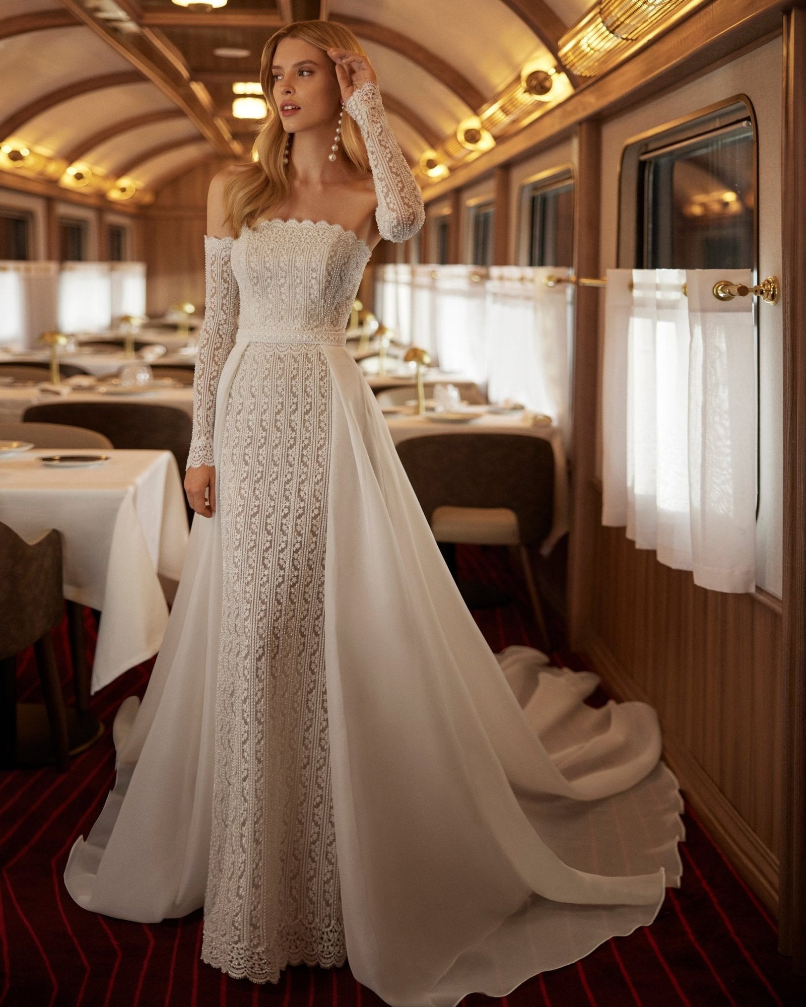 Abito da sposa sirena in stile moderno, realizzato in pizzo con dettagli luminosi di strass. Il corpetto senza spalline scolpisce la silhouette con sensualità, mentre le maniche rimovibili donano versatilità al look. La sopraggonna in garza aggiunge volume e leggerezza, trasformando l’abito in una creazione scenografica e sofisticata.