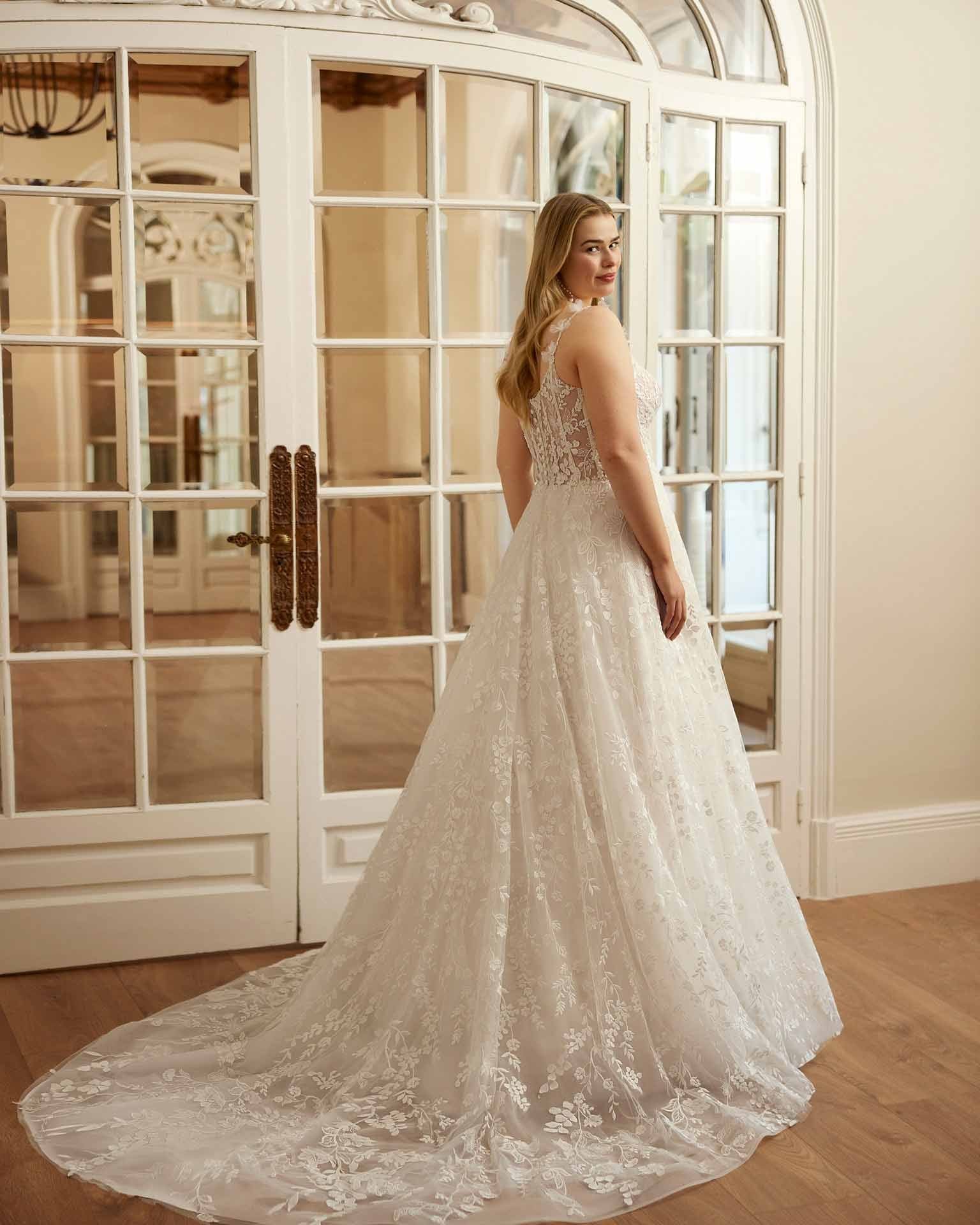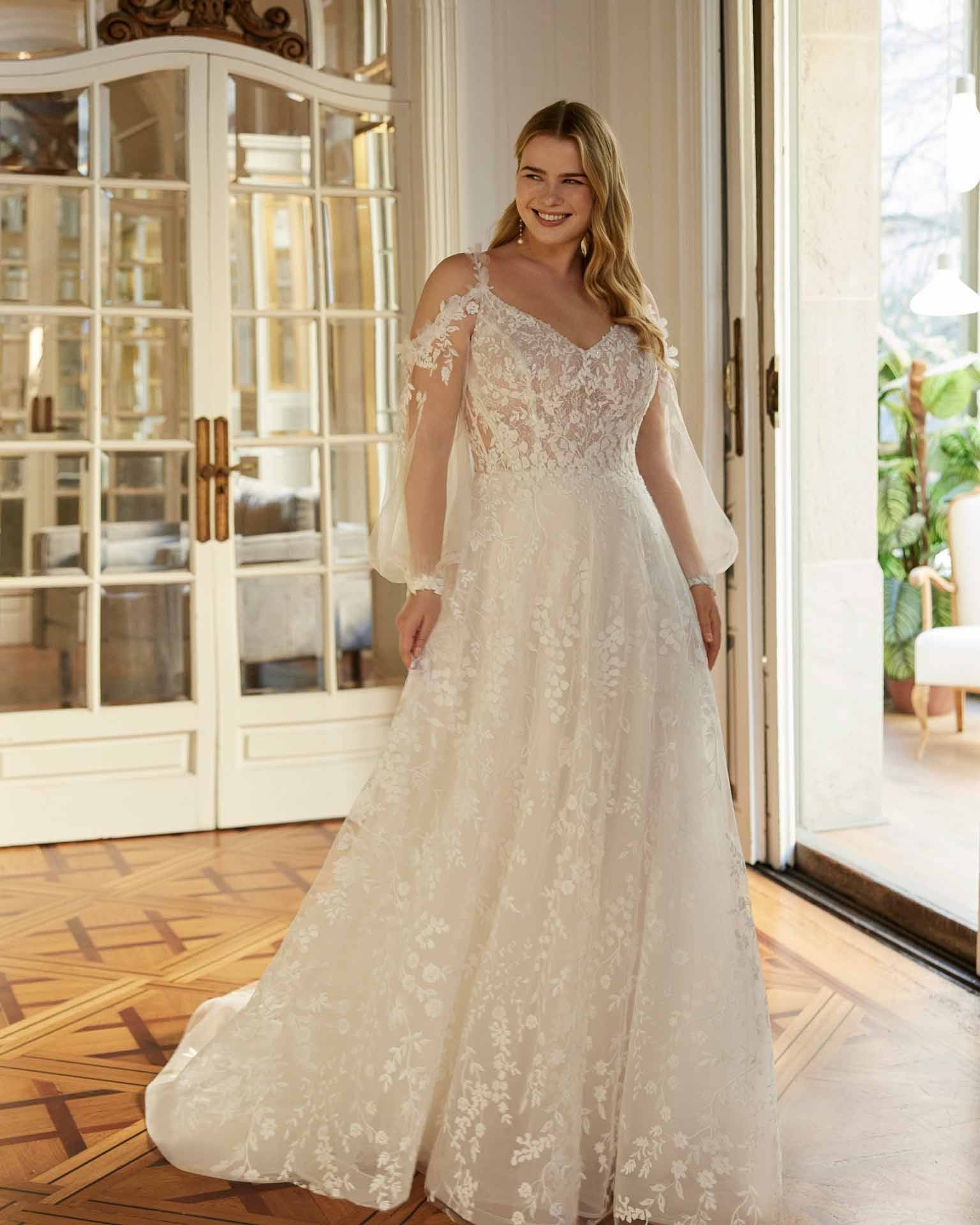 Abito da sposa romantico in stile A-line, realizzato in delicato pizzo. Il corpetto con scollo a V e sottili spalline esalta la femminilità, mentre le maniche in tulle rimovibili aggiungono un tocco versatile e raffinato. Una creazione che unisce dolcezza e armonia per un look nuziale senza tempo.