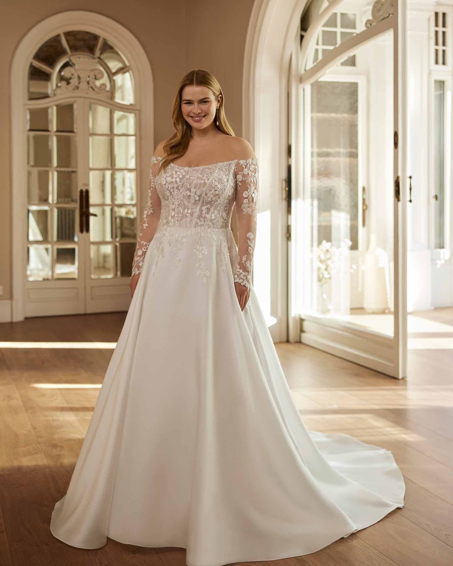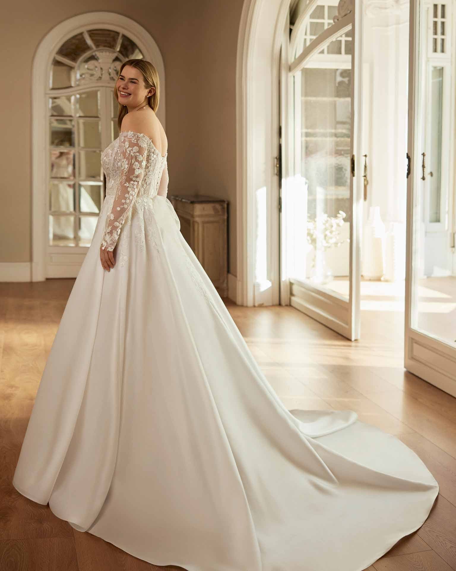Abito da sposa dallo stile principesco, caratterizzato da un ampio taglio in mikado che dona struttura e regalità. Il corpino ricamato in pizzo con delicati motivi floreali e maniche lunghe trasparenti aggiunge un tocco romantico e sofisticato. Lo scollo a spalle scoperte esalta la femminilità, mentre la gonna fluida con strascico completa un look maestoso ed elegante.
