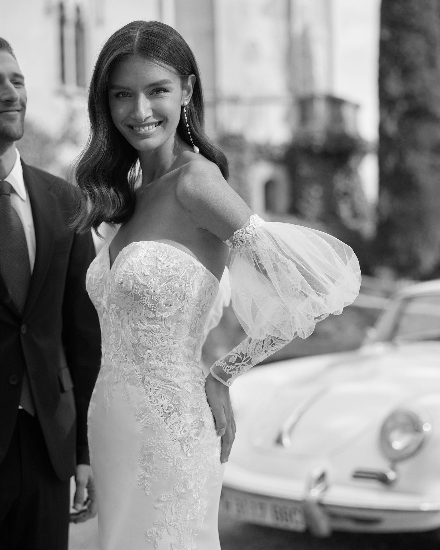 Abito da sposa sirena in mikado e pizzo; scollo a cuore e schiena con dettaglio di bottoni e maniche a sbuffo in tulle. Outfit Aire Royale da sogno realizzato in mikado e pizzo.