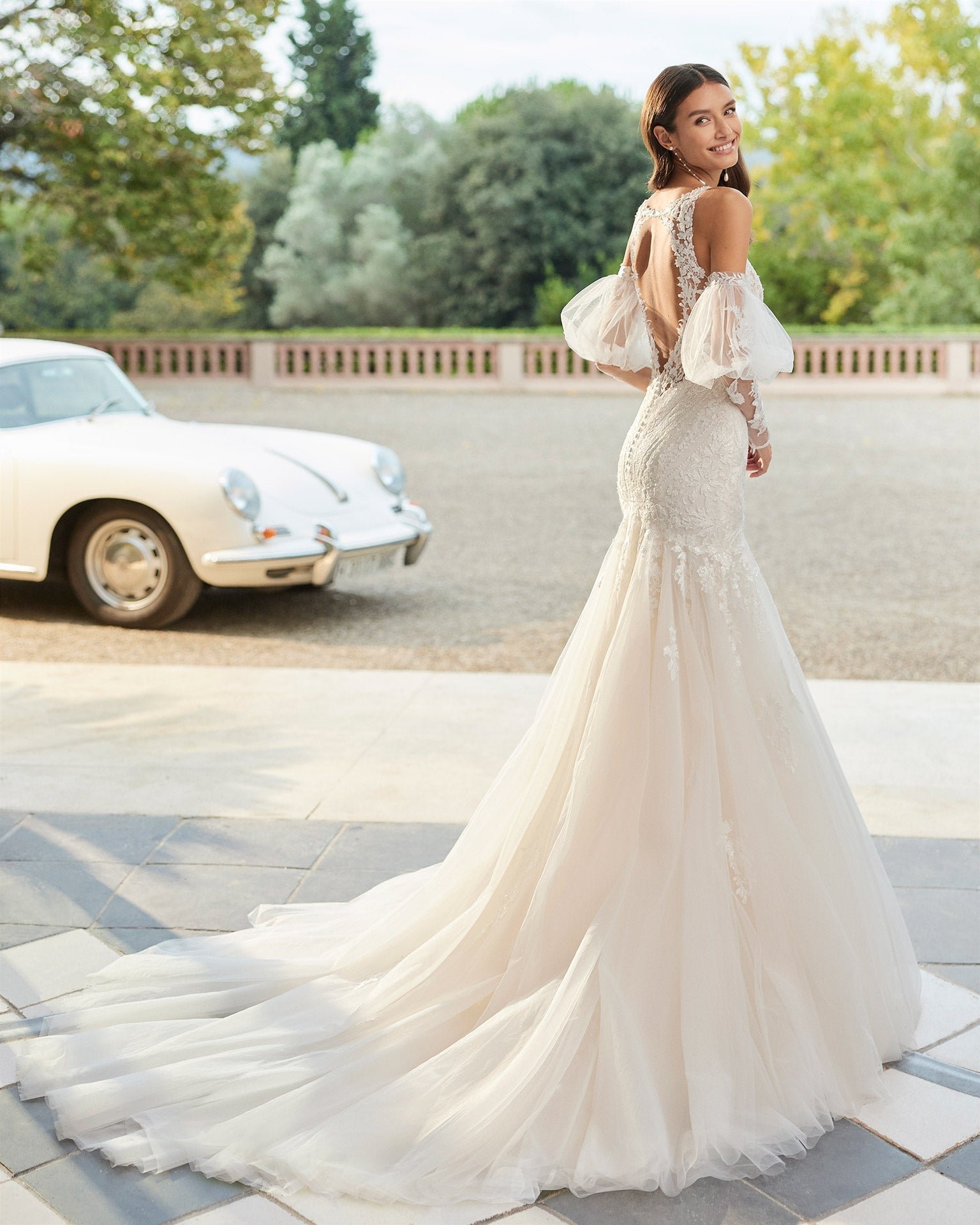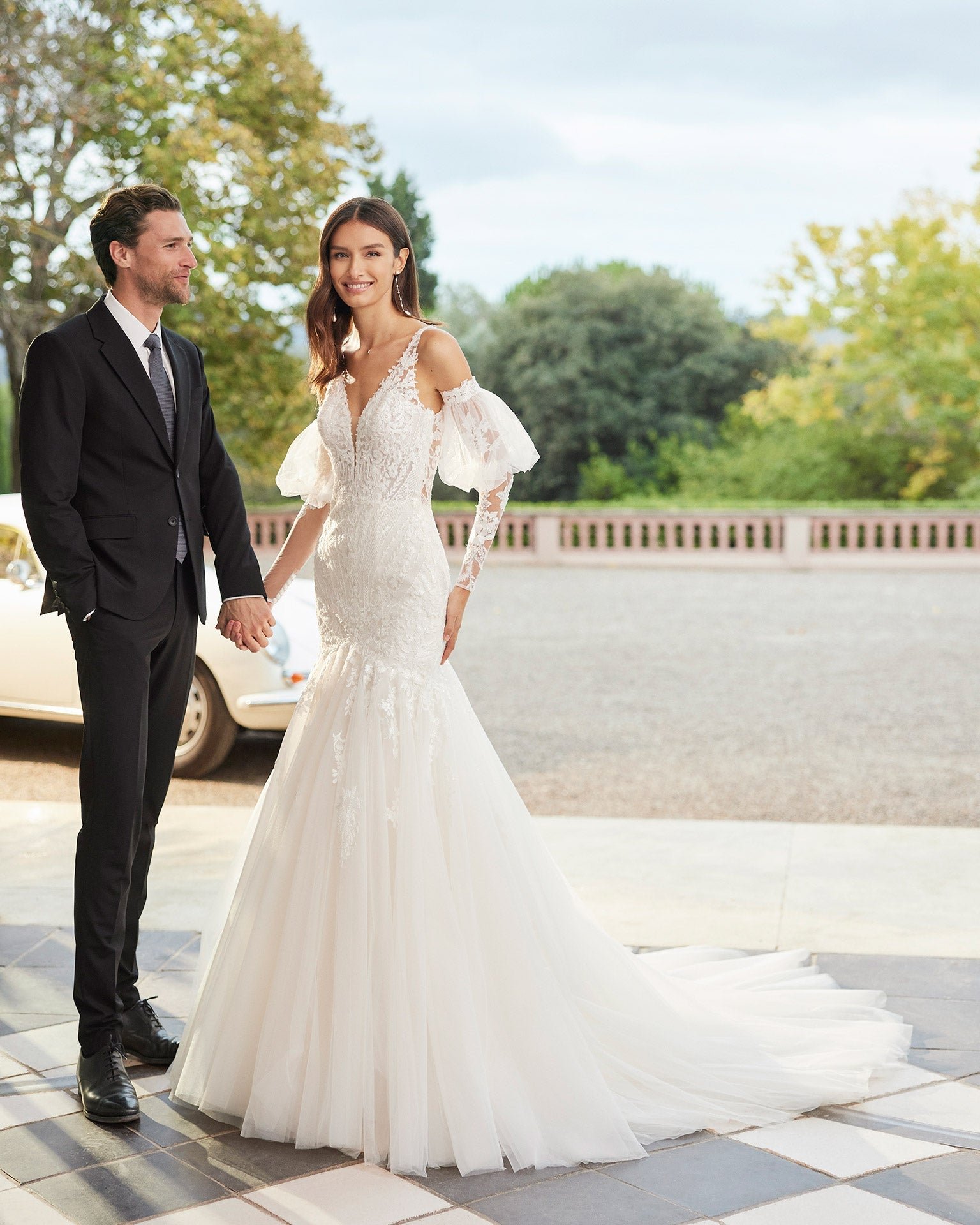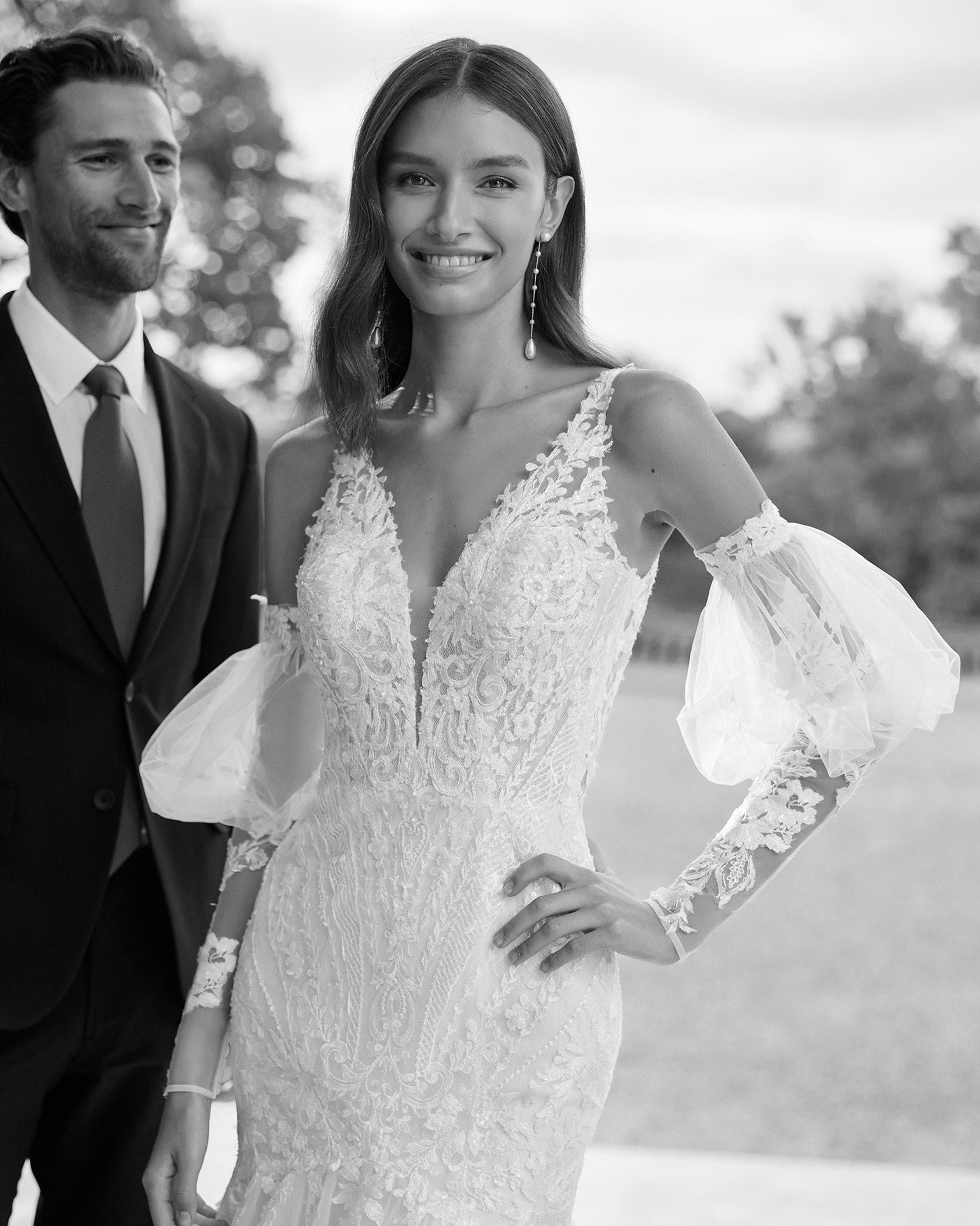 Abito da sposa sirena con gonna voluminosa e tessuto a rete lucido; effetto illusione su scollo deep-plunge e schiena scoperta, con maniche lunghe in tulle e pizzo staccabili. Look Aire Royale unico confezionato in tulle e pizzo impreziosito da strass.