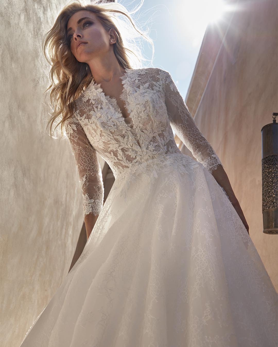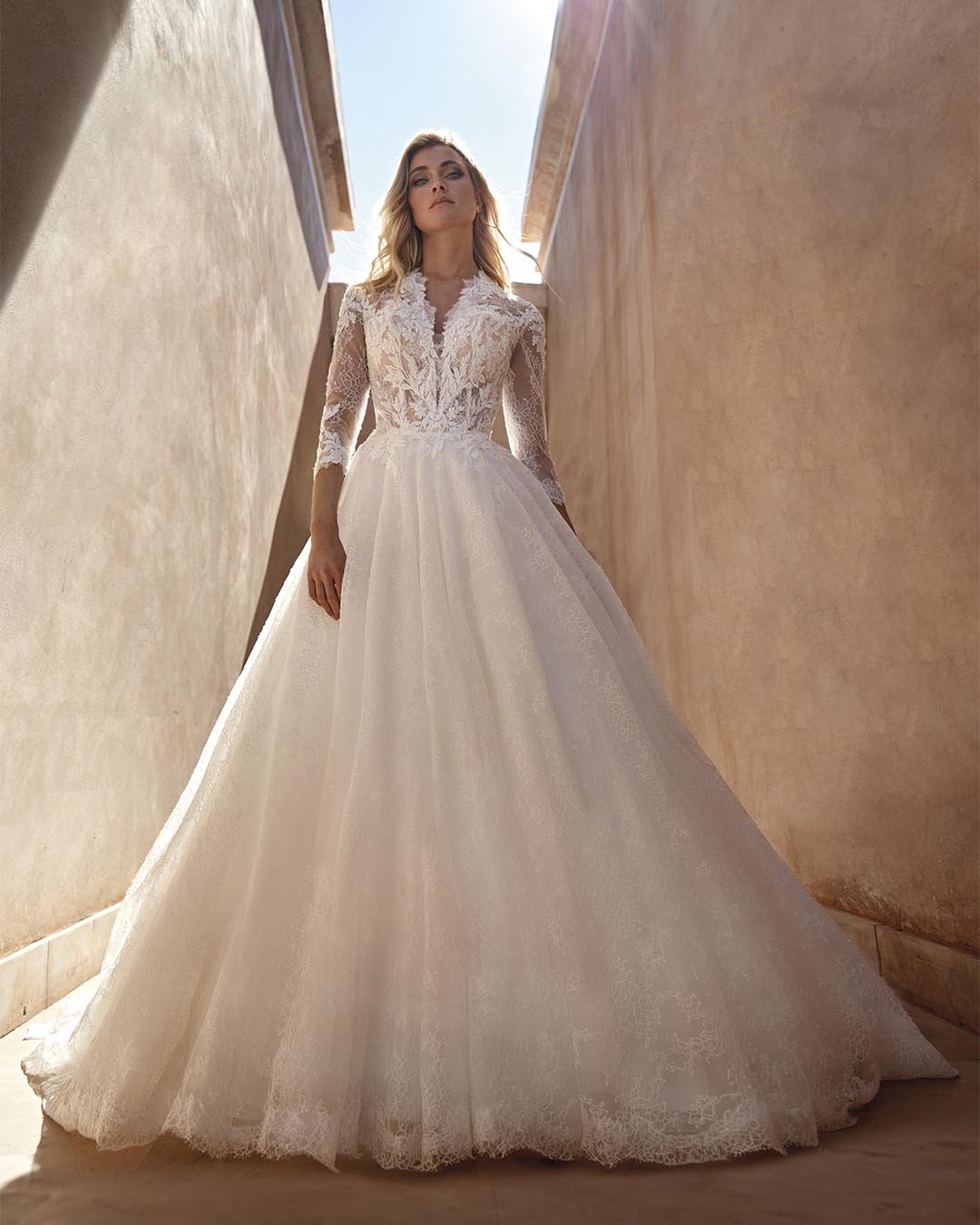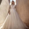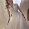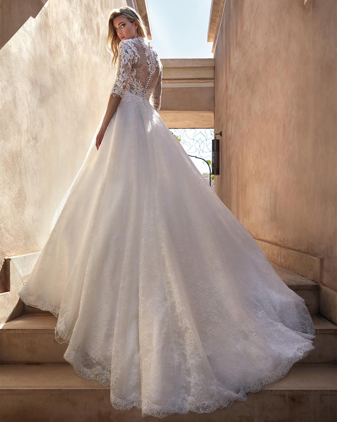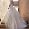 Abito da sposa dallo stile classico e raffinato, con linea A-line realizzata in prezioso pizzo Chantilly. Il corpetto elegante si arricchisce di maniche a tre quarti, mentre la schiena semitrasparente è impreziosita da una scultorea cucitura con bottoncini, dettaglio che aggiunge fascino e raffinatezza. Un modello che unisce equilibrio e grazia, perfetto per la sposa che desidera eleganza senza tempo.
