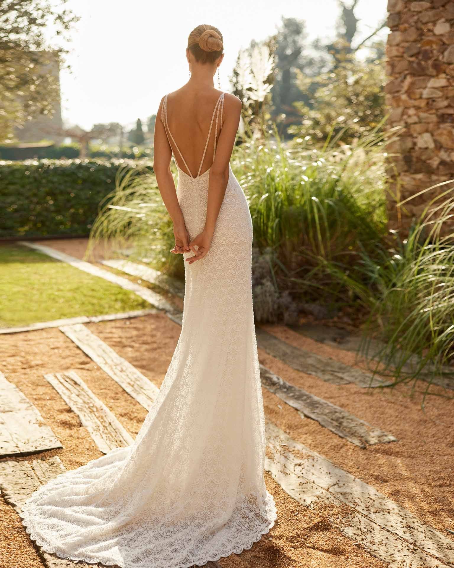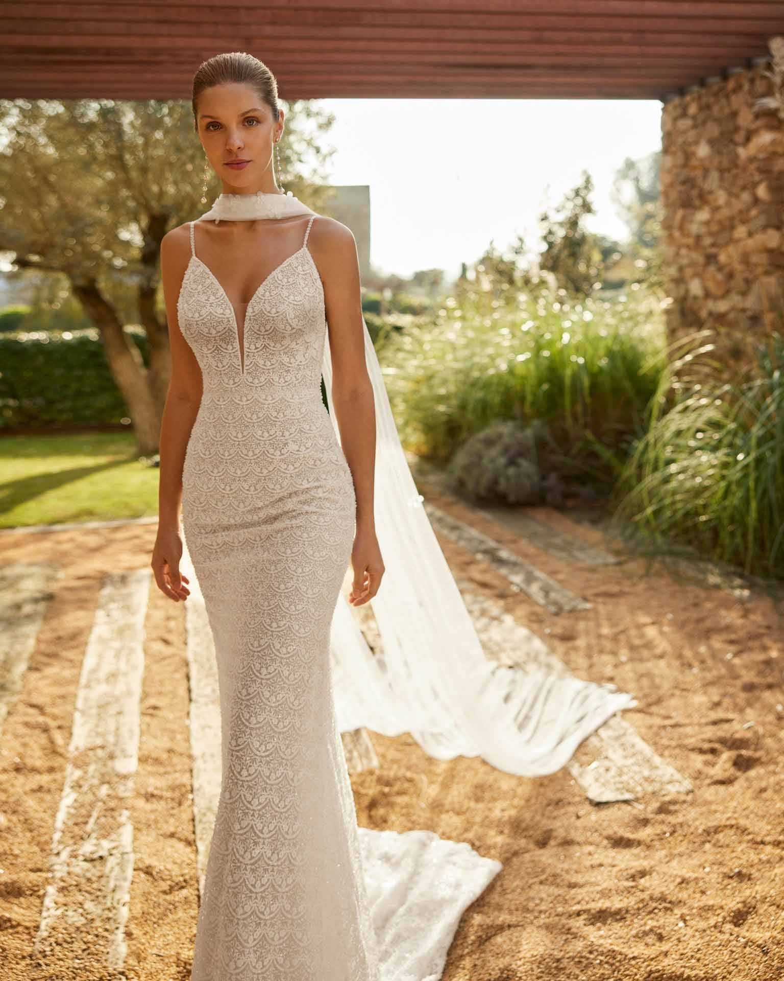 Abito da sposa a taglio dritto realizzato in raffinato pizzo con delicate applicazioni di perline che illuminano l’intero design. Lo scollo profondo è valorizzato da eleganti spalline perlate, mentre la schiena scollata dona un tocco sensuale e sofisticato. A completare il look, un mantello leggero che aggiunge movimento e un’aura regale.
